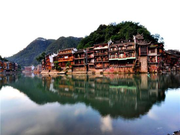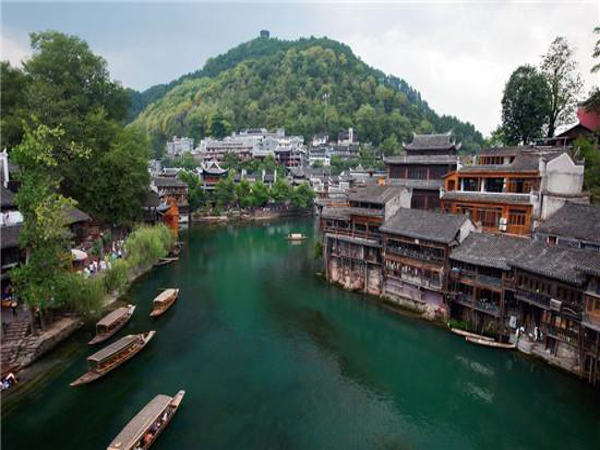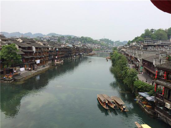 沒有想象中的古老城樓,取而代之的是吊腳樓,街邊整整齊齊坐著販賣各種繡品、紀念品的苗家老人,再往里一點,見到便看見清澈的沱江,一陣清風吹來,有江水的濕氣,亦有對面餐館的飯菜香,過往的游客或在戲水,或在渡江,亦或擺出各種姿勢拍照,我想,也許這就是新的生活方式,簡單而溫馨。