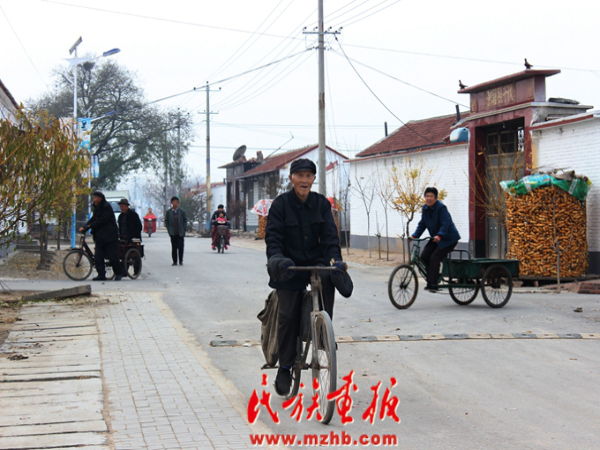 寬廣整潔的村道上,來來往往村民騎著各種代步工具