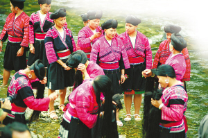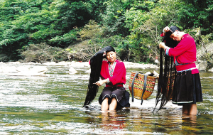 紅瑤女子的長發平均在1.4米以上。村寨前后的河灘邊、泉水邊,就是她們的天然梳妝臺