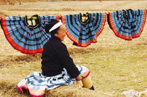 白褲瑤女人體態婀娜。這婀娜既來自于她們風擺楊柳般的百褶裙,也來自身上前后兩片的夏衣。夏衣,黑色的調子,沒領,沒袖,前面是一塊和肩膀寬度相等的正方形素布,后面則是用蠶絲布來制作的裙邊土布,上面繪滿了蠟染和花繡圖案。用漿染土布縫制成的百褶裙上,布滿了手繪而成的彩色圖案。其最復雜的工序,一是借粘膏樹汁憑空勾畫,二是用花線依著粘膏樹汁描過的隱約印痕,一點一點地挑繡出彩色圖紋來。做好一條裙子,往往需要花上女人們半年的時間。