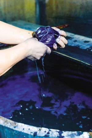藍靛染布是一項古老的工藝,是白褲瑤服飾文化的重要組成部分。白褲瑤婦女用藍靛草來提取染布用的靛泥,隨時染藍、青棉線和青布。縫制衣物的白棉布用藍靛這種天然染料染色,其色澤與一般的機織布印染有所不同。2018年8月拍攝。