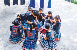 南丹縣瑤族服飾代表性傳承人黎鳳珍在染坊免費教授前來學習的小學生。2018年拍攝。